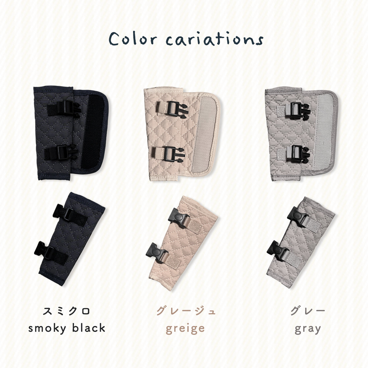 チャイルドシート、車内の雰囲気に合わせやすい「スミクロ」「グレージュ」「グレー」の3色をご用意しました。