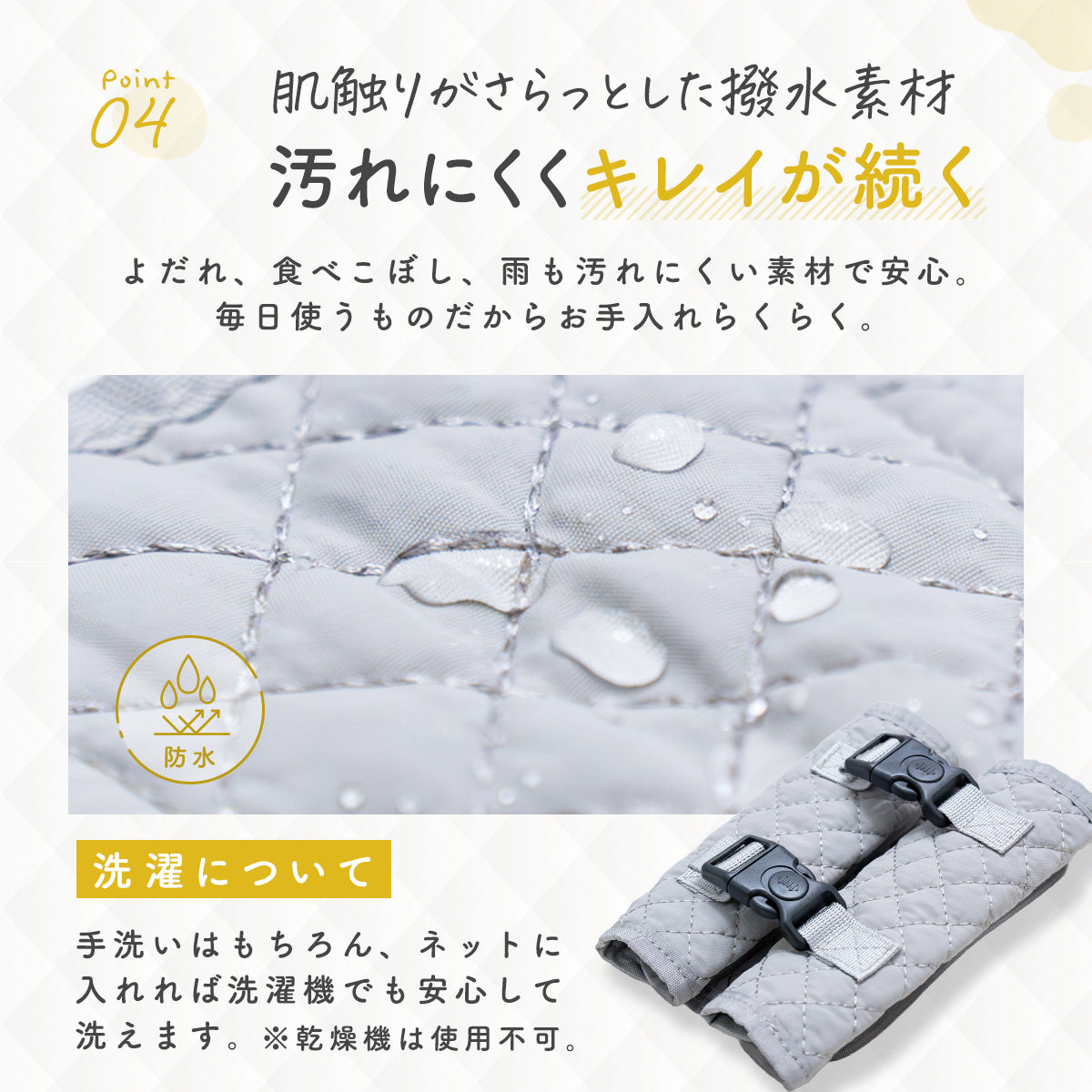 撥水加工されているので汚れも付きにくく、汚れたら丸洗いが可能です。