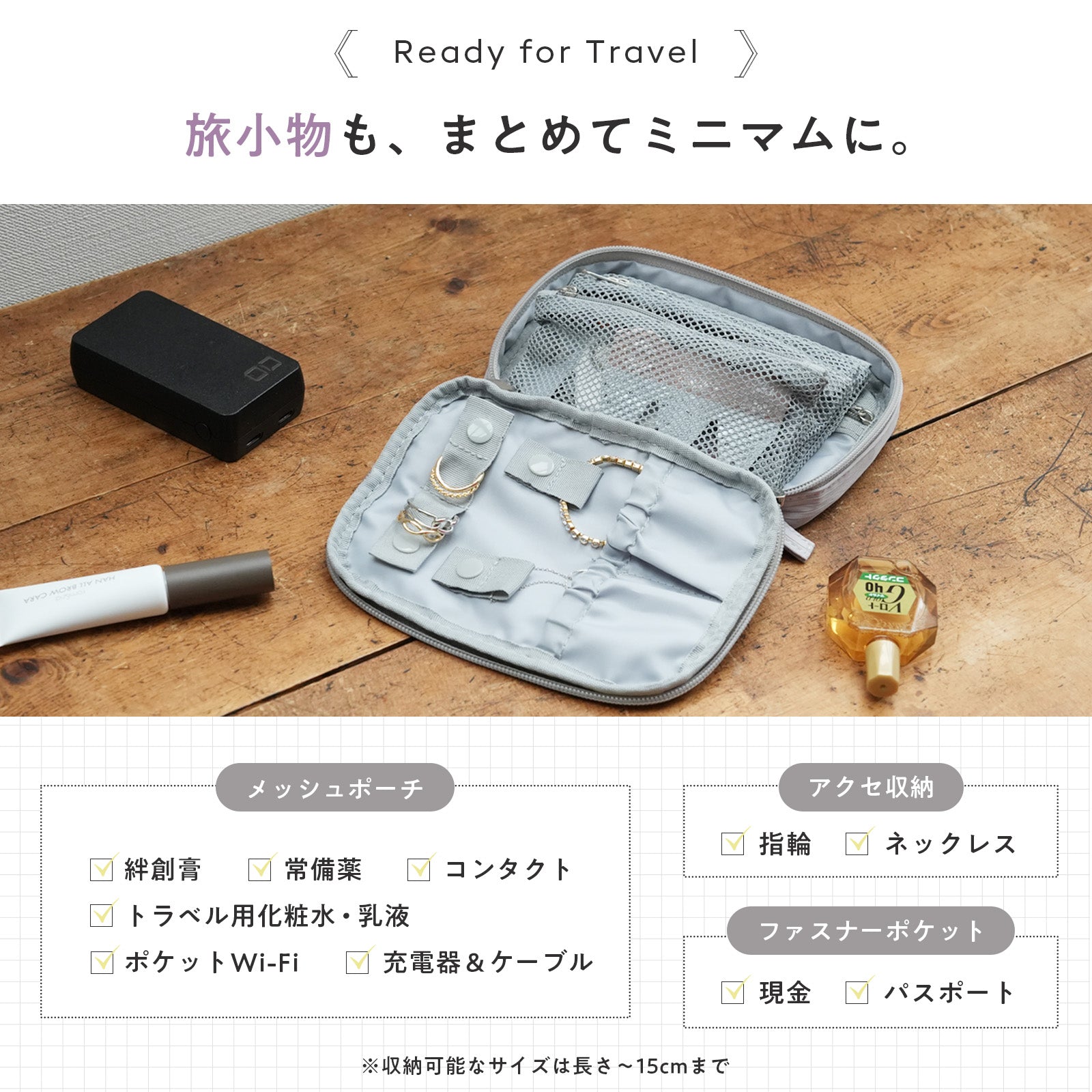 本のようにめくれるマルチポーチで、旅の小物をコンパクトにまとめて収納。