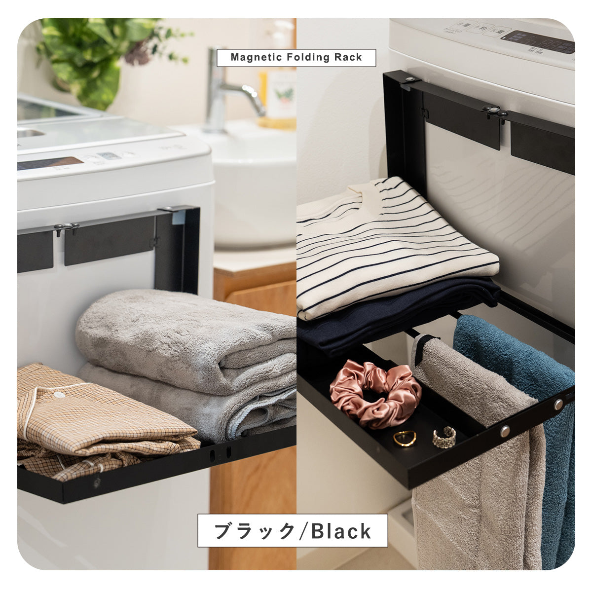 洗濯機にピタッと貼り付けるだけの簡単設置で、しっかりと取り付けできます。