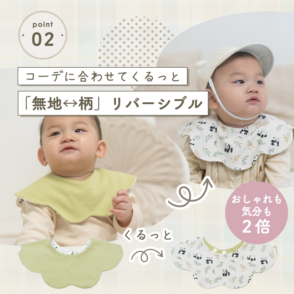 スナップボタンで付け外しもかんたん。2段階のボタンがあるので、お子さまの首回りや成長に合わせて、サイズの調整が可能です。